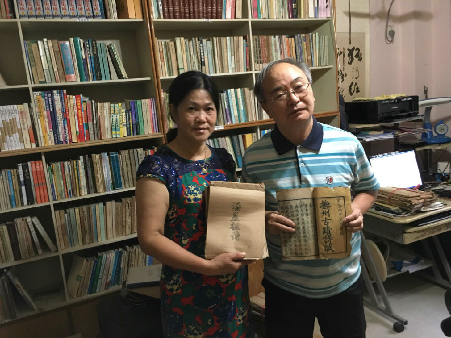 此次捐书以戏曲研究方面书籍为主,创造了我馆接受个人捐赠图书记录,其中包括《汤显祖传》《汤显祖大传》两种图书的珍贵手稿,以及乾隆丙申夏友筠堂刻板《抚州古迹诗赋》珍稀古籍。厚厚几大本的《汤显祖传》手稿全部用水笔填写,字迹工整清晰,历经30多年仍然保存完好;《抚州古迹诗赋》对抚州文史有重要研究价值,该书目前在全国只有两本,另一本由南京大学图书馆馆藏。对此,龚老师表示,“只有把这些书籍捐在图书馆,才是最好的去处,可以方便更多的人学习研究”。