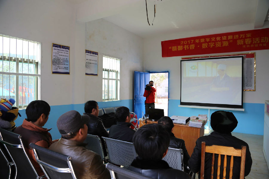 为营造新春佳节欢乐祥和的节日气氛,将图书馆优质资源惠及广大读者,使图书馆春节主题活动在全市范围内形成联动,突出图书馆对于文化惠民的重要意义,元月16日,在市文化广电新闻出版局组织下,市图书馆一行9人前往东乡县小黄镇洋湖村,1、开展了“数字资源进万家”送文化下乡活动。利用文化信息资源共享平台,下载了《崇仁麻鸡的养殖》《猪的养殖》《水稻的种植》等数字资源,在小黄镇洋湖村文化活动室进行播放。