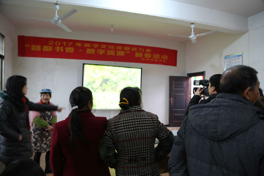 开展了2017年数字文化资源进万家“赣鄱书香 数字资源”新春活动。利用文化信息资源共享平台,下载了适合本地种植、养殖、家电维修等数字资源,如《崇仁麻鸡的养殖》《猪的养殖》《水稻的种植》《小家电维修》等,在村文化活动室进行播放。