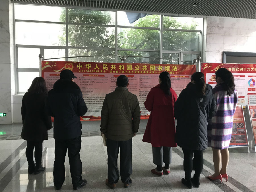 首先是加大全馆工作人员学习《公共图书馆法》的力度。《公共图书馆法》颁布后,我馆立即组织编印了《公共图书馆法》宣传册,向各部门、科室发放,对《公共图书馆法》学习宣传和贯彻落实工作进行了安排部署,利用每周五下午集体学习时间,组织全馆干部职工认真学习了《公共图书馆法》全文,孔彬馆长在北京参加中央文化管理干部学院培训期间,聆听了中图学会霍瑞娟秘书长的权威讲解,并向全体职工传达,就立法背景和法律亮点等与大家进行了深入探讨。