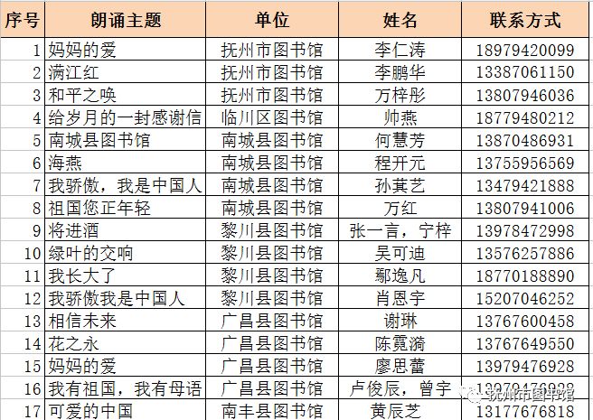 复评阶段将把选出的30个视频于(5月15日)放到抚州市图书馆微信公众号上,市民通过搜索(抚州市图书馆)微信公众号在5月16日至5月21日(下午5点关闭投票入口)期间对朗诵视频投票,通过产生的票数高低来决定名次,最终在5月24日评选出一、二、三等奖和优秀奖,获奖者可在活动结束后到所在图书馆领取奖品和个人荣誉证书。