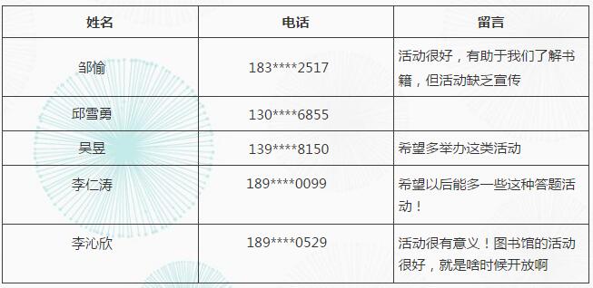 此次活动从参与读者中随机抽取了5位优秀读者代表获奖,附活动情况如下: