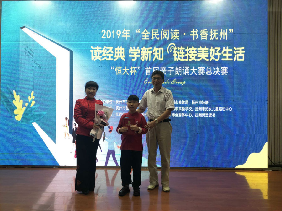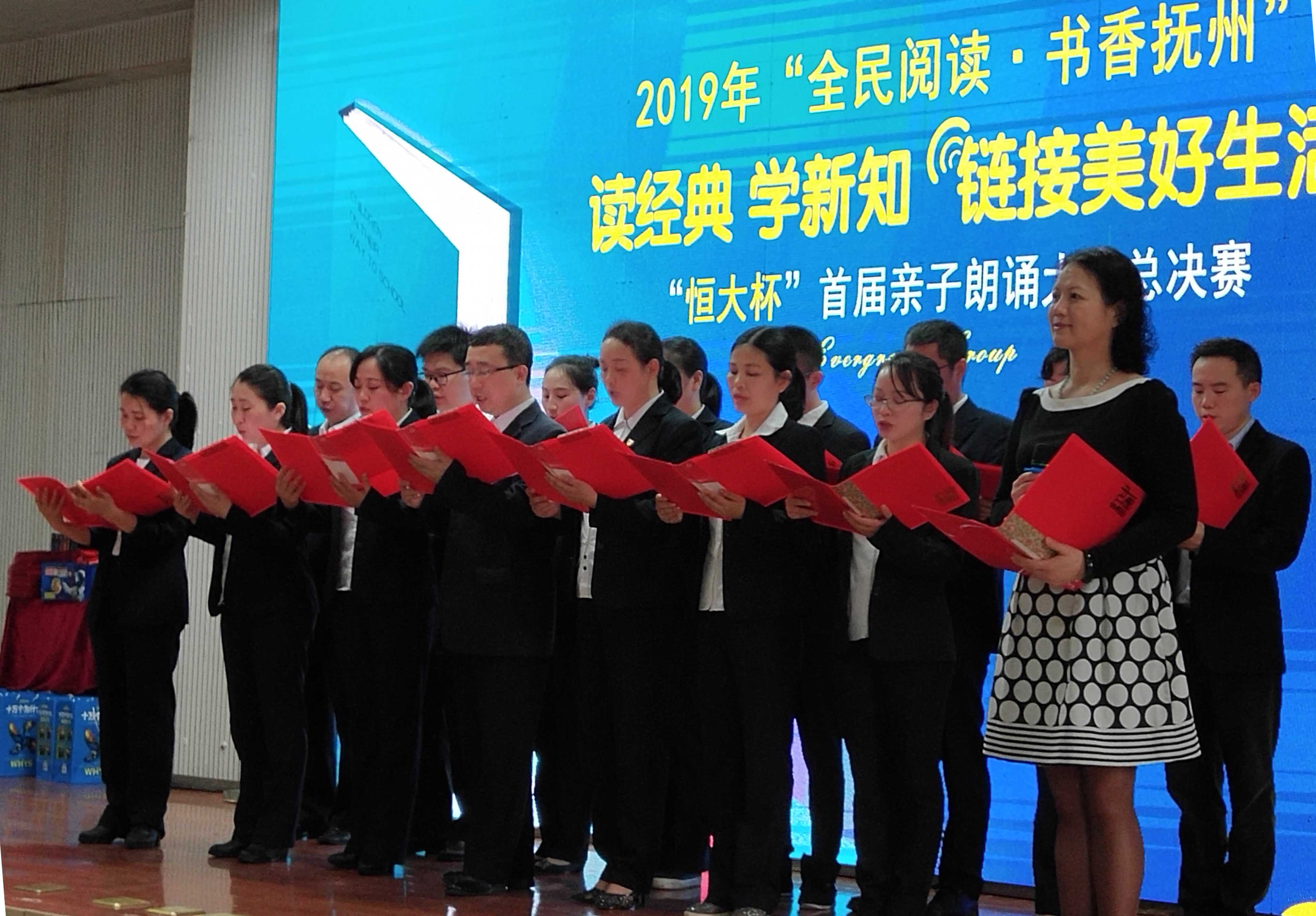 人间四月天,正是读书时!为贯彻落实党的十九大精神,促进全民阅读,为迎接第24个“世界读书日”的到来,4月23日,由抚州市文明办、抚州市文广新旅局、抚州市教体局、抚州市妇联主办,抚州市图书馆、抚州市图书馆学会、抚州市实验学校、抚州市妇女儿童活动中心承办,江西新华发行集团抚州市分公司、抚州市全媒体中心、抚州樊登读书协办的2019年“全民阅读·书香抚州”启动仪式暨“4.23世界读书日”首届亲子朗诵大赛决赛在抚州市实验学校火热开赛。抚州市文明办副主任乔保安,市文广新旅局副局长陈高赞,市教体局调研员章星期,市妇联调研员付晓红,抚州市实验学校校长喻华堂,江西新华发行集团抚州市分公司总经理方新富,抚州市全媒体中心副总经理饶建明,恒大集团抚州公司总经理刘辉,抚州樊登读书会会长付清青等相关领导嘉宾出席了本次比赛。