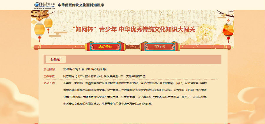 近年来,教育部一直倡导需要在全社会树立科学的教育质量观,强化对学生综合素质的培养。为加强在青少年群体中弘扬和传播中华优秀传统文化,树立青年一代对我国优秀传统文化的认同感和自豪感。2019年8月1日-8月31日期间,同方知网(北京)技术有限公司联合全国各级各类公共图书馆、文化类机构单位共同开展“知网杯”青少年中华优秀传统文化知识大闯关活动,培养青少年积极主动学习传统文化的兴趣。