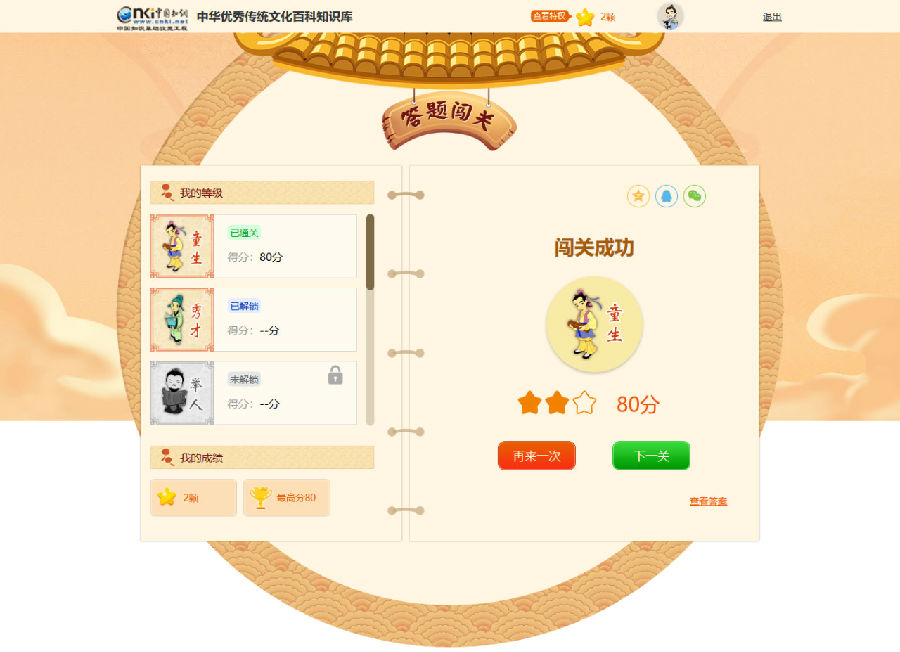 1)答题闯关规则:每一关达到60分以上即可继续闯下一关,否则可以选择“再来一次”,直至成绩合格方可继续闯关。