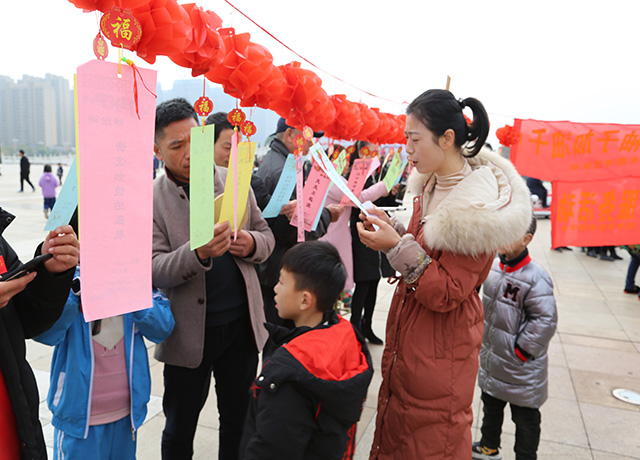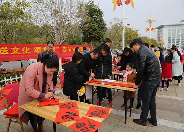1月1日上午,由市文广新旅局主办,市文化艺术发展中心、市图书馆、市文化馆、市艺术创作研究所、市文化活动中心、江西新华发行集团有限公司抚州市分公司承办的2020“红色文艺轻骑兵”新春送文化下基层在名人雕塑园广场开展。文艺演出、书写春联、猜谜语、图书赠送同时上阵,吸引了众多市民。在送春联活动中,针对市民需求,现场创作个性化春联作品。在猜谜语区,不少市民聚集在一条条谜语前,仔细阅读谜语,认真思考,得出答案后告知现场人员,答案正确当场就可领取牙膏、毛巾等奖品。