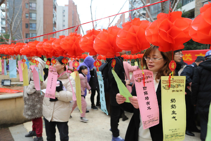每条谜语都像是一件手写的艺术品,五颜六色地悬挂在一楼大厅中。这些谜语集知识性、趣味性和娱乐性于一体,既有传统的字谜、物品谜、成语迷、地名谜等现场气氛十分活跃。活动现场既有戴着花镜看谜面的老人,也有几岁的孩子,更多的是年轻群体。他们仔细阅读谜语,或驻足凝思,或共同探讨,体会着中国文字游戏的睿智,感受着中华文明的渊源。猜中者喜获奖品,兴趣倍增,体验着成功的快乐。猜错者也不气馁,再接再厉,表现出极大的热情。书法家们不畏严寒挥毫泼墨,为满足不同居民的要求,他们书写了一副副寓意美好的春联。