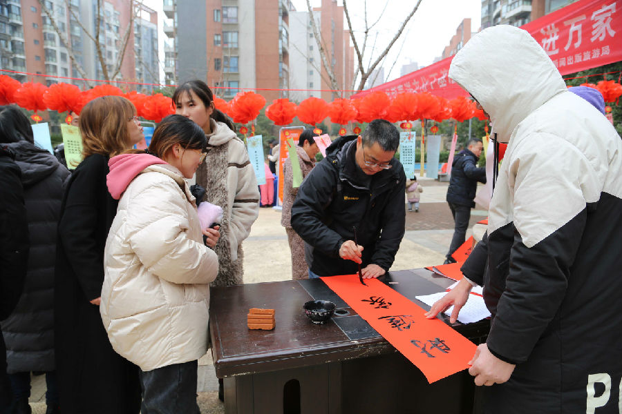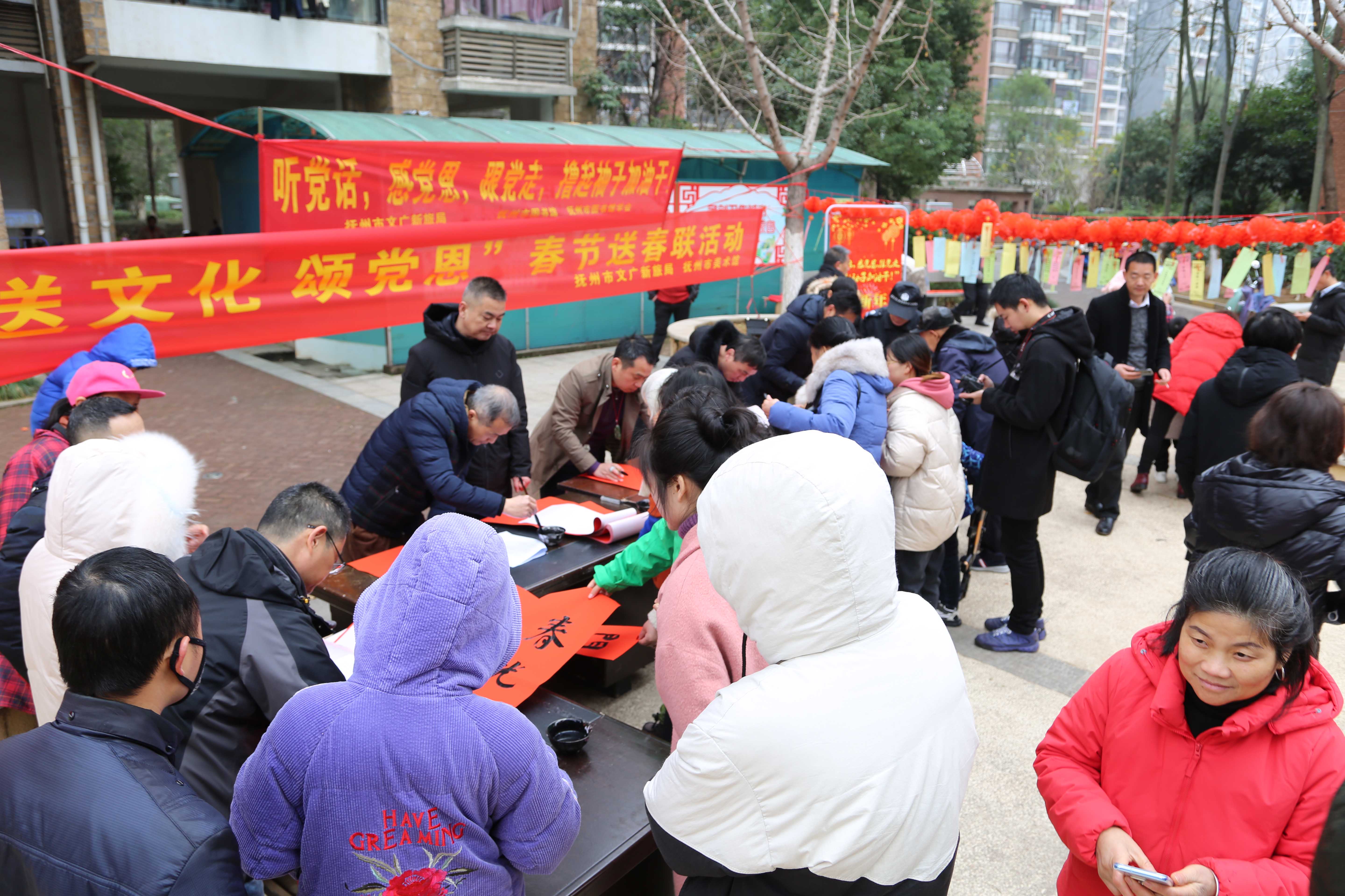1月17日,抚州市文广新旅局联合市美术馆、市图书馆、市图书馆学会、市文化馆、市文化活动中心30余名文艺志愿者,共同走进临川区西大街思梦社区开展迎新年送春联、猜谜语活动,为社区居民送去新年祝福。