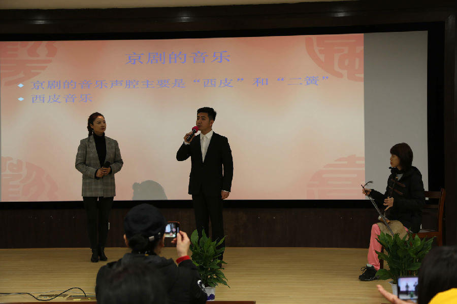 讲解期间,还邀请中国国家京剧院优秀老生演员张奕明,中国国家京剧院演出中心制作人、主持人孟令西,陕西省京剧院优秀考生演员胡晓楠为大家现场演绎京剧唱段,专业的弹奏、富有韵味的唱腔,大家听得叹为观止,如痴如醉,掌声迭起。