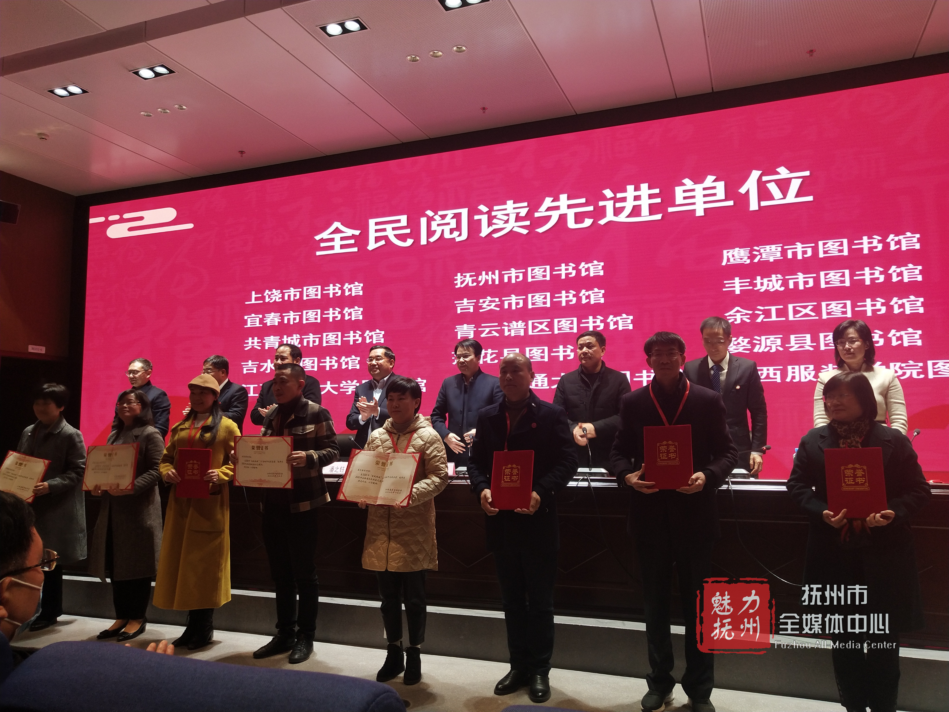 在全省图书馆年会上,与会各级领导充分肯定了近年来我省图书馆事业所取得的重要成就并对下一阶段全省图书馆工作提出新的要求,2020年我市各级图书馆继续秉持“传承文明、服务社会”的初心,各项工作圆满完成,在年会上斩获了多项殊荣。其中,抚州市图书馆荣获“全民阅读先进单位”称号、临川区图书馆荣获“江西省古籍保护工作先进单位”称号、崇仁县图书馆荣获“第十届‘读好书’活动先进单位”称号、黎川县图书馆荣获“公共数字文化服务先进单位”称号、南丰县图书馆李秀华荣获“江西省古籍保护工作先进个人”称号。