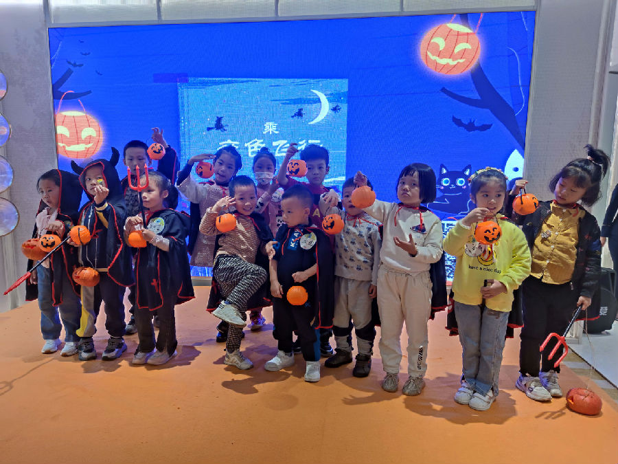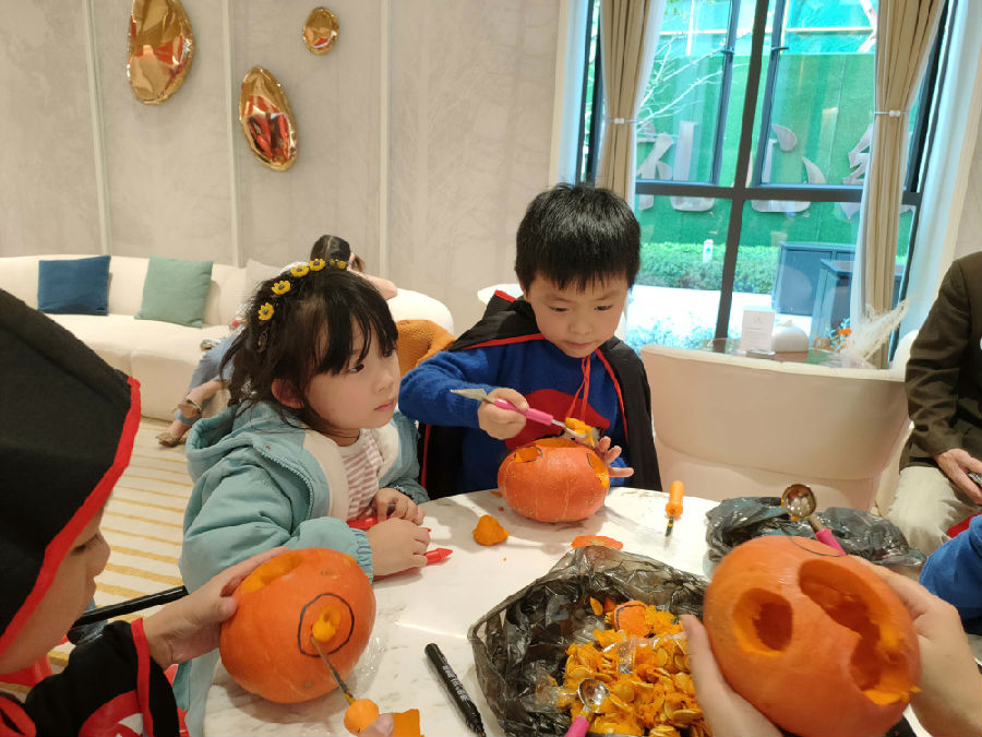 活动中,为了打造沉浸式场景阅读,孩子和家长们变装女巫融入场景,以家庭为单位亲子共读一本书——《乘夜色飞行》,进行“不给糖就捣蛋”的角色扮演,并共同制作南瓜灯、玩木乃伊游戏。趣味十足地互动,让孩子们在进行思考和阅读的同时,也开心地度过了亲子时光。