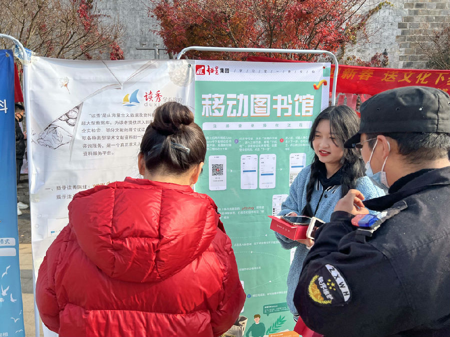 此次数字资源推广主要就“读秀学术搜索平台”及“超星移动图书馆”进行宣传推广,通过海报展示和专人讲解,吸引了许多居民和游客驻足。