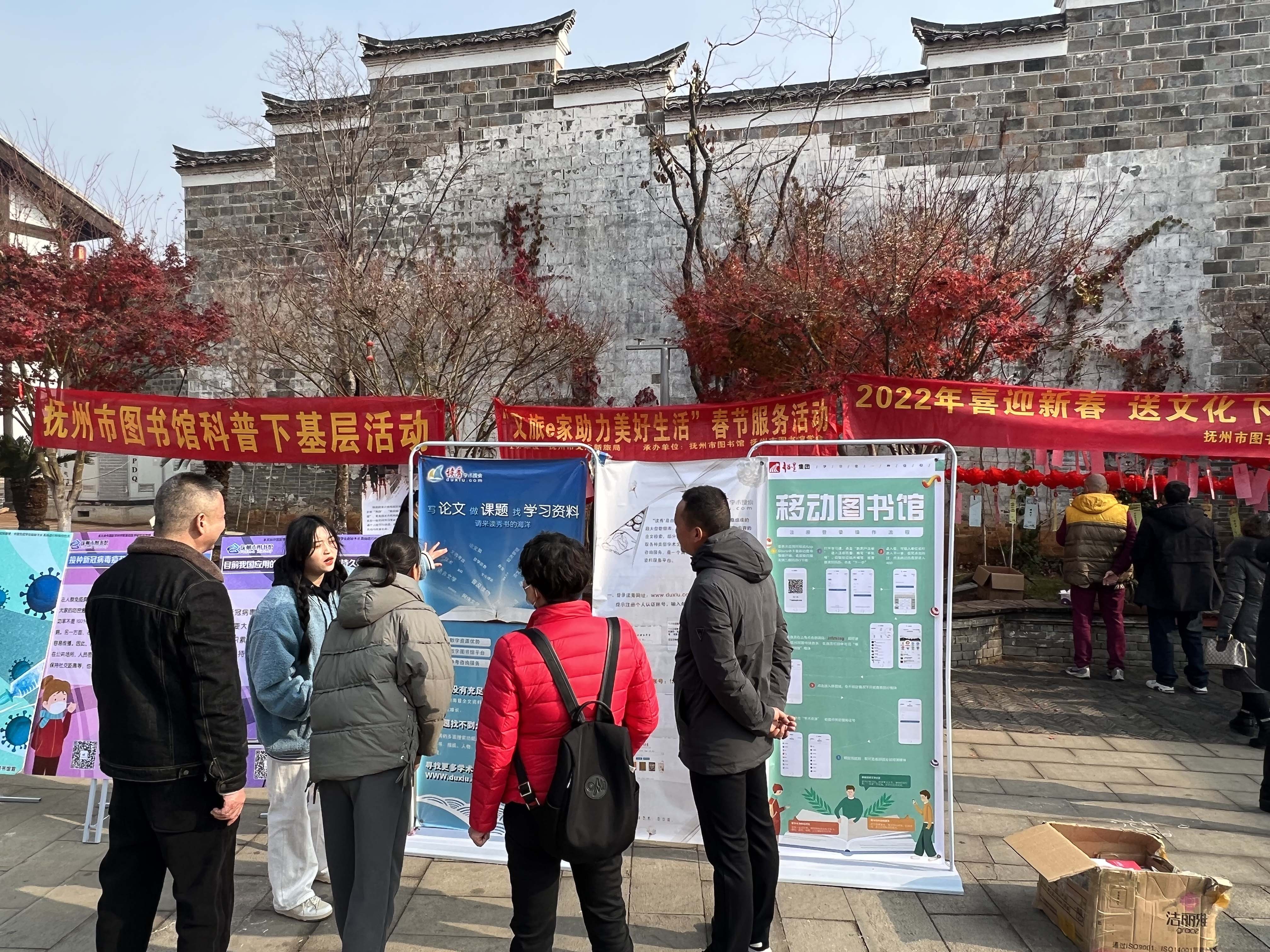 2022年元月1日、2日,抚州市图书馆志愿者一行前往文昌里景区开展数字资源推广活动。