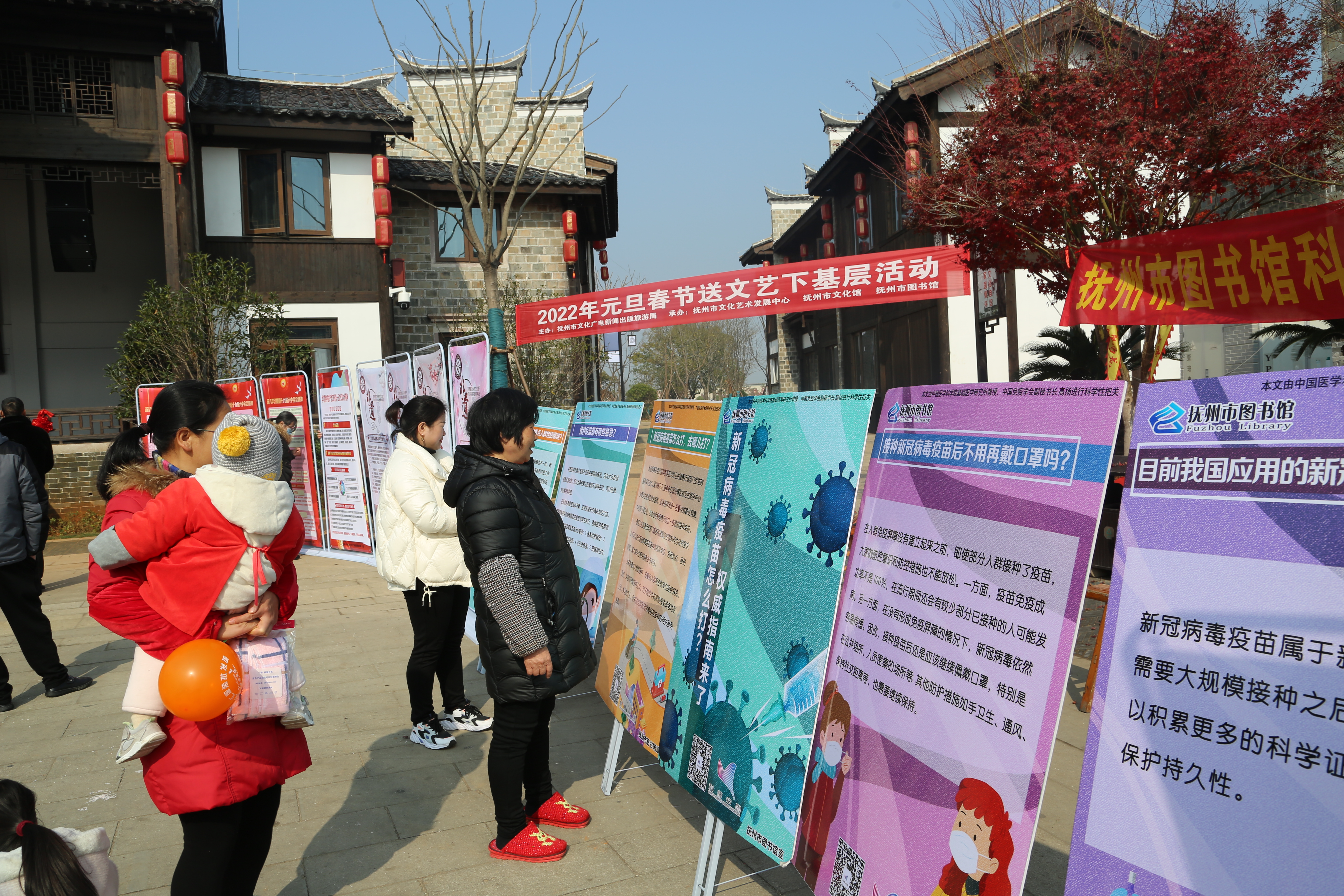 2022年元月1日、2日,抚州市图书馆志愿者一行前往文昌里景区开展科普下基层活动。此次活动主题以“新冠疫苗怎么打”为主题,通过展板宣传及现场讲解的方式,对当前形势下的疫情防控重点进行逐一展示。