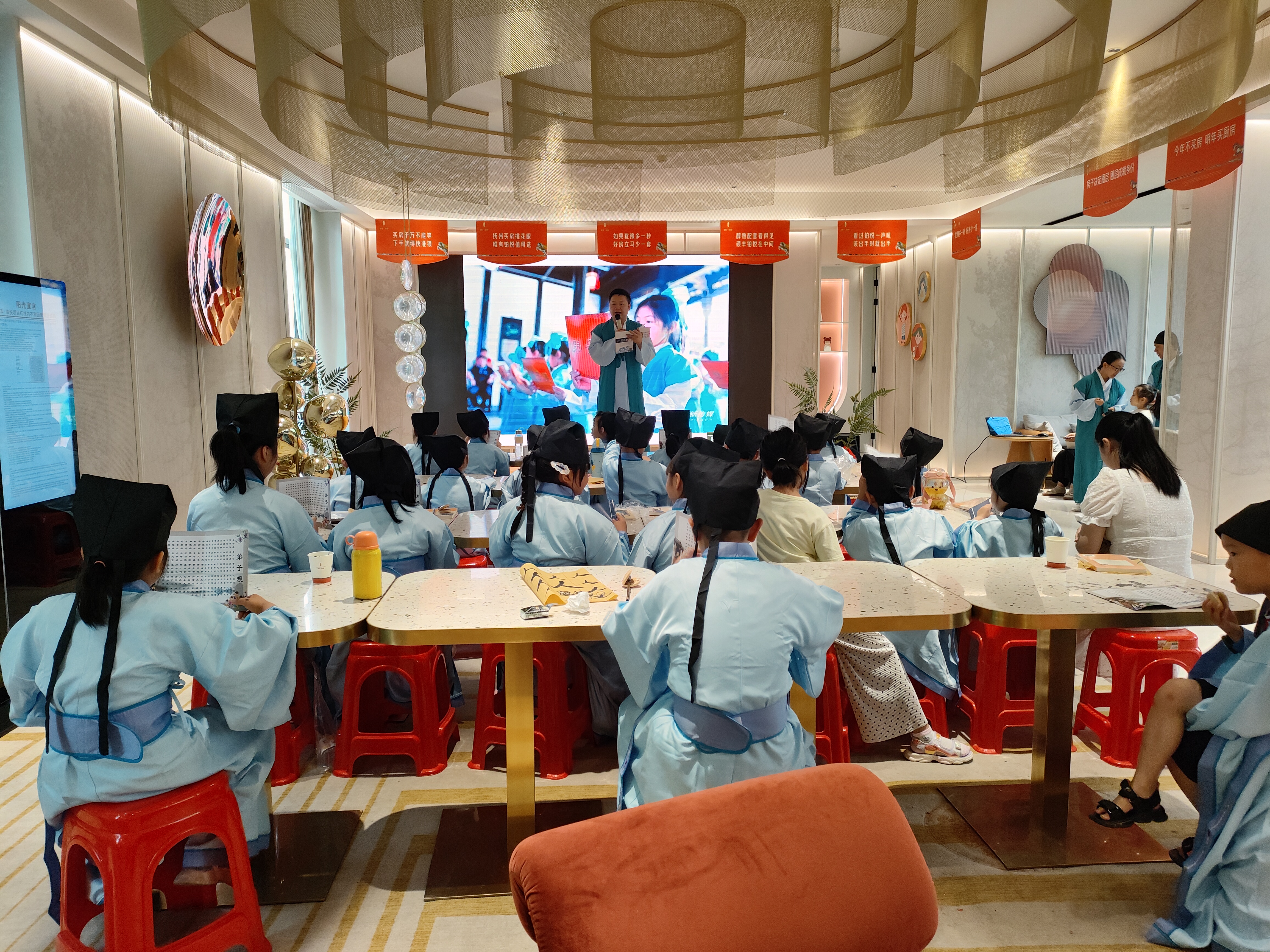 为了让少年儿童走进我国传统文化,在暑期受到良好的传统文化熏陶,抚州市图书馆携手小读者学堂走进抚州市高新区硕丰铂悦开展以“童蒙养正 少年养志”为主题的暑期国学公益夏令营活动。