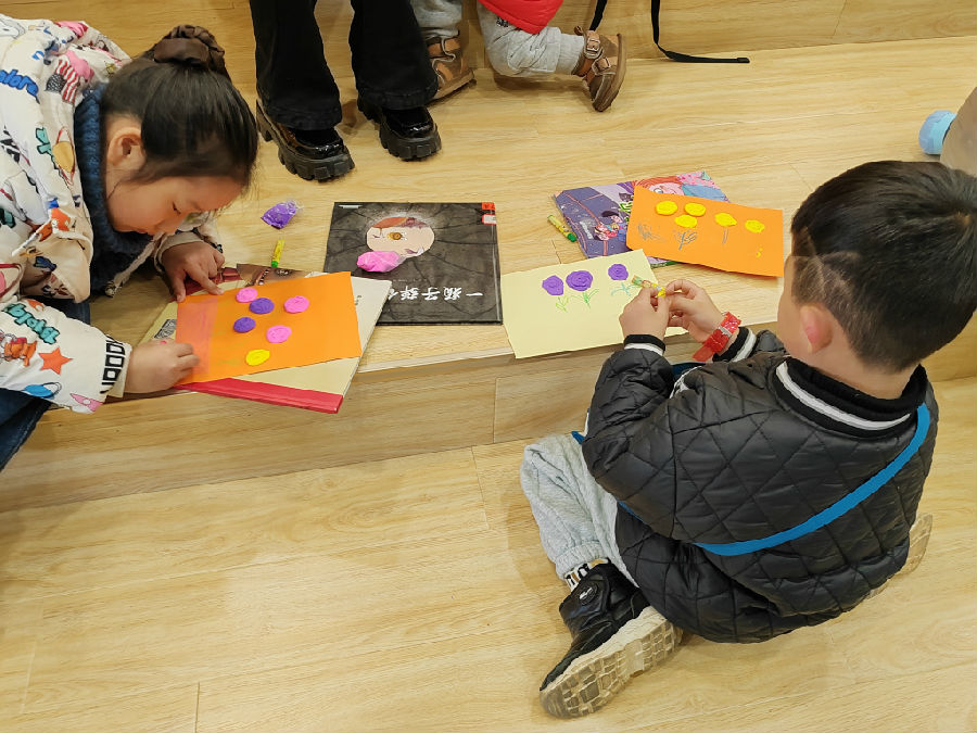 活动现场,小徐老师首先提出问题“花婆婆是一个什么样的人?”有意识的带领孩子们进行思考,让孩子们在生动的绘本故事中认识花婆婆,喜欢上花婆婆,并向花婆婆学习——做一件让世界变得更美丽的事。在绘本延伸环节,小徐老师也邀请家长和孩子们一起发挥奇思妙想,做出了绚丽多彩的花花贺卡,一起让世界变得更加美丽。
