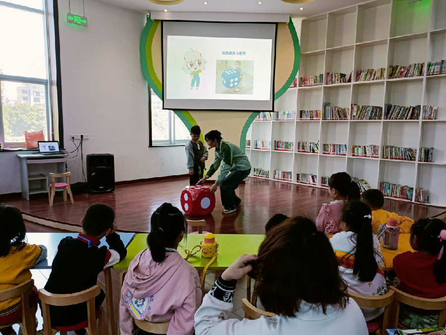 故事讲解结束后,老师拿出家务骰子和孩子们进行模仿游戏,帮助孩子们用已有的生活经验来表演与模仿平时爸爸妈妈在家打扫卫生的场景,让其他参与的亲子家庭进行竞猜,让大家感受劳动节的快乐。