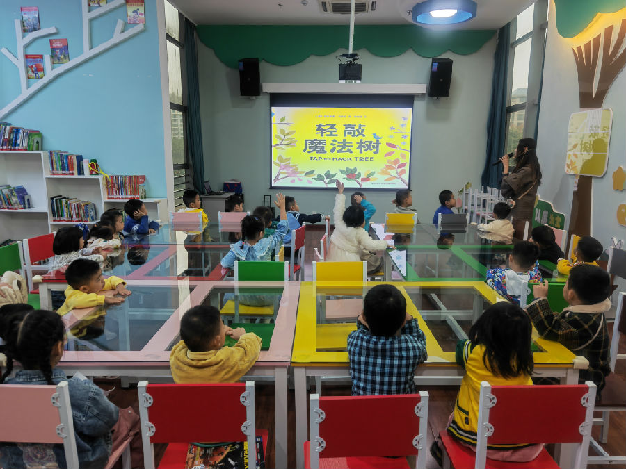 气氛活跃了之后,老师和小朋友共读《轻敲魔法树》,《轻敲魔法树》讲述的是一棵光秃秃的棕色大树有魔法,轻轻敲一下,然后翻到下一页,一片嫩绿的叶子长了出来;继续多敲几下,再试着摇摇它,摸摸它,给它一个飞吻……花开了,苹果长出来了,树叶在秋风中飘落下来……