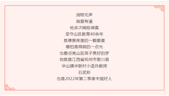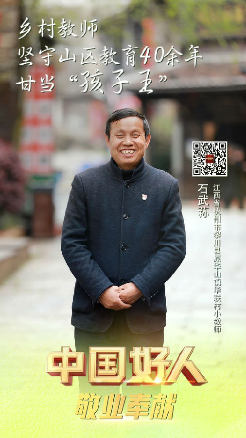 润物无声,施爱有道,他多次婉拒调离,坚守山区教育40余年,就像黑夜里的一颗星星,哪怕是微弱的一点光,也要点亮山区孩子美好的梦,他就是江西省抚州市黎川县华山镇华联村小退休教师石武荪,也是2022年第二季度中国好人。以实际行动播下“好人”种子,让人间大爱促其生根发芽。《中国好人》特别节目将于12月27日(今天)20:37在中央广播电视总台社会与法频道(CCTV-12)揭晓,石武荪从2022年全国605位“中国好人”中脱颖而出成功入选重点发布对象将在节目中亮相并向全国人民讲述自己的故事。