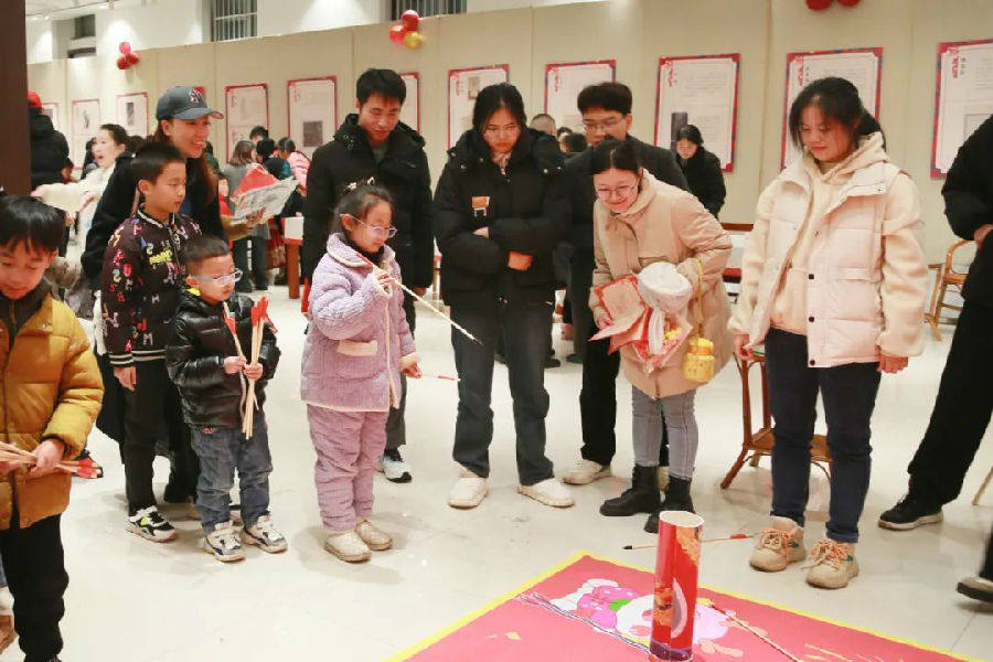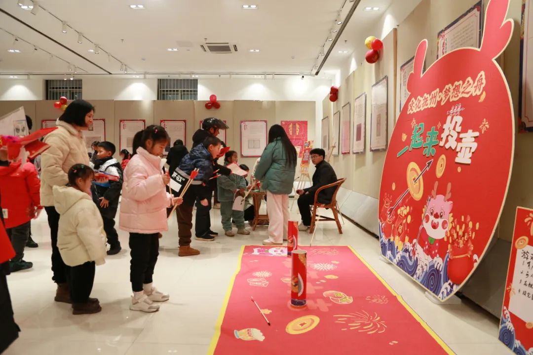 “福龙迎春投壶游戏”区域,读者们参与投壶游戏,体验古代礼仪和宴饮游戏的乐趣;