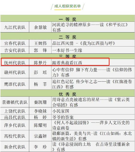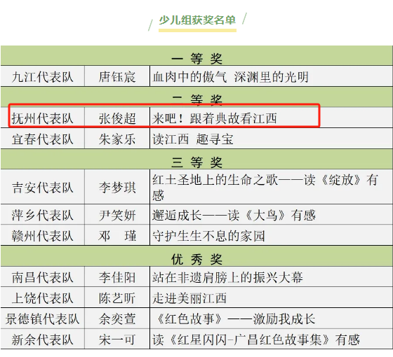 经过激烈角逐,张俊超荣获少儿组二等奖,陈梦丹荣获成人组三等奖,抚州市图书馆获优秀组织奖。