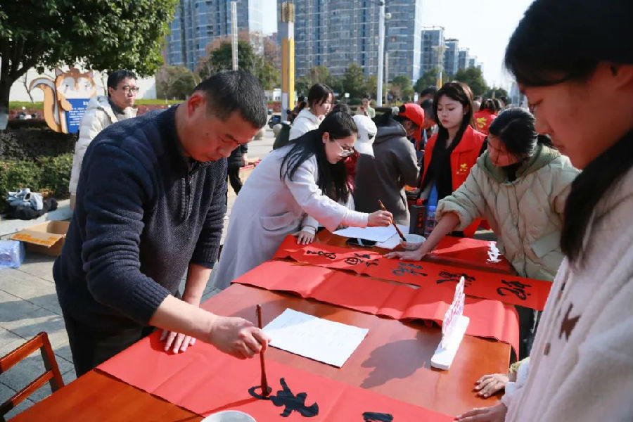 春联送福区域,六位抚州知名书法家与现场书法爱好者齐聚一堂,笔墨飘香,气氛热烈。笔锋婉转间,一幅幅寄托着美好期许的吉祥春联跃然纸上。