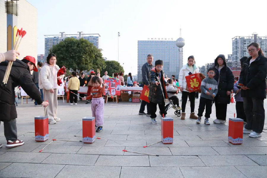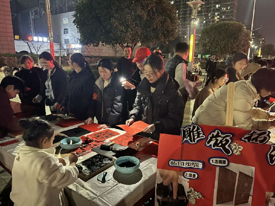 文创集市更是热闹非凡。非遗雕版拓印、剪窗花、投壶、猜灯谜、翻蛇,多种多样的民俗活动吸引了众多市民参与。市民们可以亲自动手体验这些传统技艺,感受传统文化的独特魅力。集市上还有各种文创产品出售,让人们在购物的同时,也能把这份文化记忆带回家。