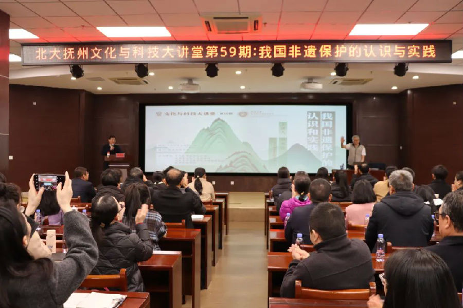 本次大讲堂特别邀请到了文化和旅游部原党组成员、副部长项兆伦担任主讲嘉宾,讲座主题为“我国非遗保护的认识与实践”。本次讲座由抚州市文广旅局党组书记、局长傅武彪担任主持,参与人员还有北大文创院执行院长杨玉娟、抚州市文广旅局副局长李威、抚州市图书馆馆长杨磊、大理文化生态保护区保护发展中心副主任杜漪、北大文创院院长助理熊君玥、北大文创院学术交流部副主任李耀宗,抚州市及各县区非遗中心干部,抚州非遗传承人,东华理工大学、赣东学院、抚州职业技术学院师生团队,北大文创院干部职工共计120余人参与本次讲堂。