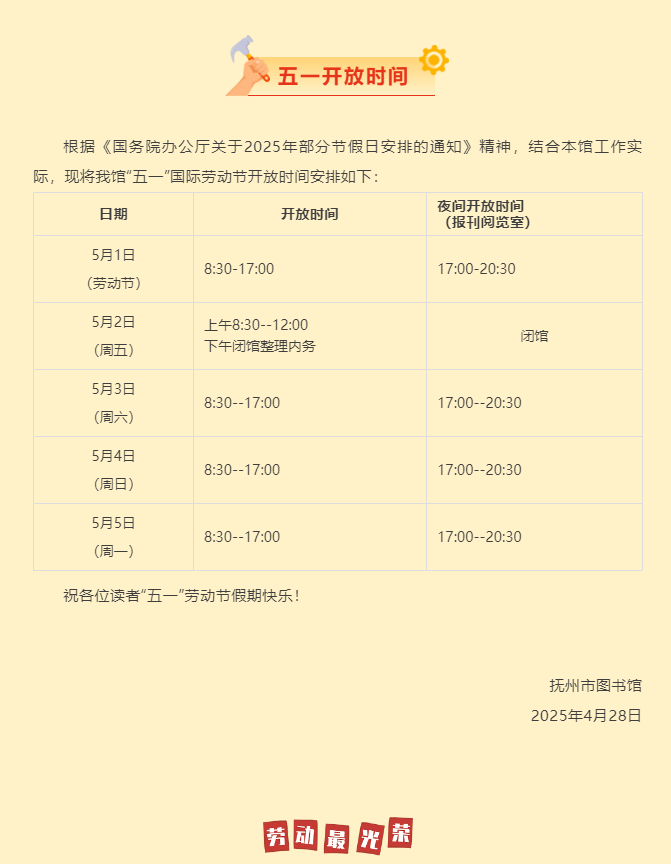 通知 | 抚州市图书馆2025年“五一”劳动节期间开放时间安排