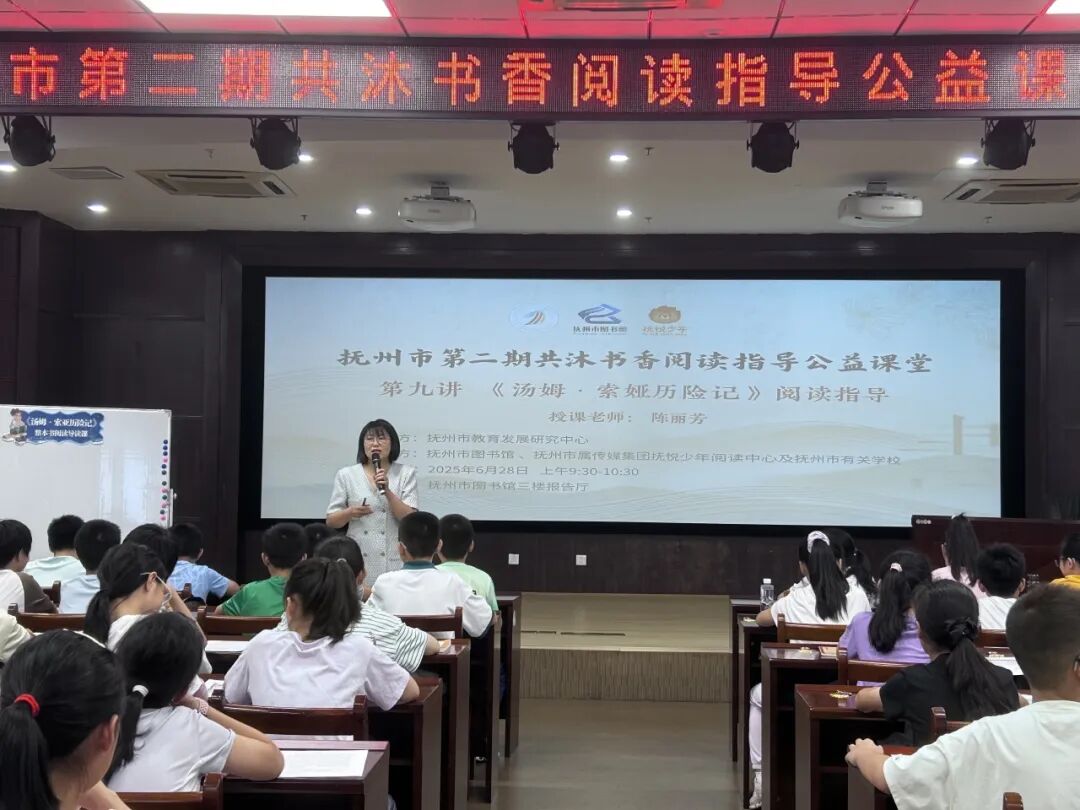 2025 年6月28 日,抚州市教育发展研究中心主办 ,抚州市图书馆、抚州市属传媒集团抚悦少年少儿阅读中心及相关学校联合协办的 “共沐书香” 第二期第九讲阅读指导公益课堂再掀热潮。本次活动特邀教育部名师领航工程王文娟名师工作室核心成员陈丽芳老师,以美国作家马克・吐温的经典名著《汤姆索亚历险记》为核心,为现场百余名学生带来了一场沉浸式的 “阅读冒险”。通过趣味互动、情境体验与深度解析,带领孩子们走进汤姆的奇幻世界,感受文学经典的魅力。为现场读者打造了一堂融合情境体验、媒介互鉴与深度思辨的《汤姆·索亚历险记》整本书阅读课,让经典名著在现代课堂中焕发新生。