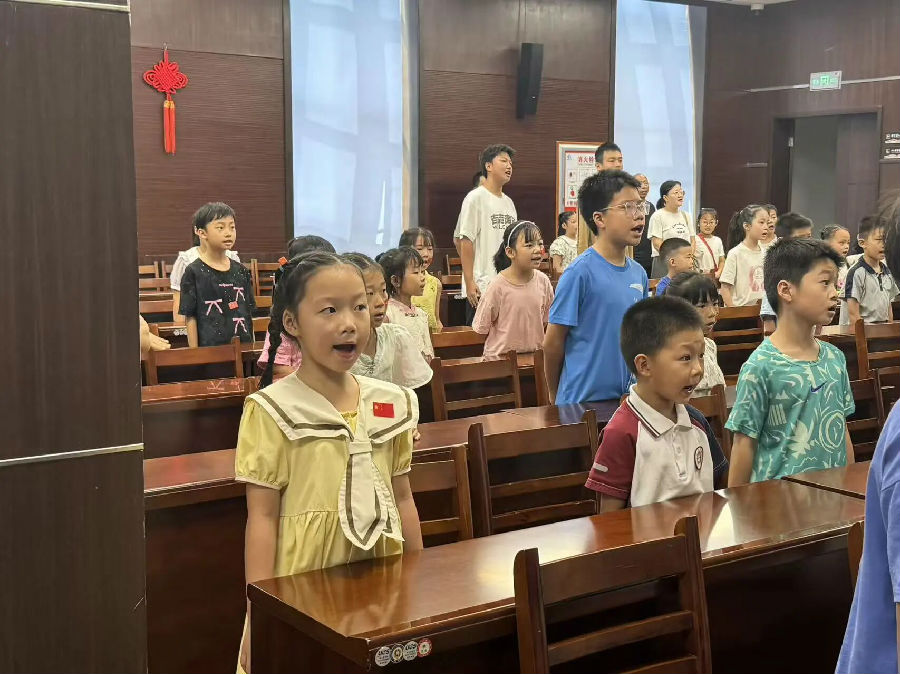 活动在庄严的国歌声中拉开序幕。孩子们胸前贴着国旗贴纸,肃立齐唱,清澈的童声在报告厅回荡,开启了这场充满仪式感的国庆之旅。