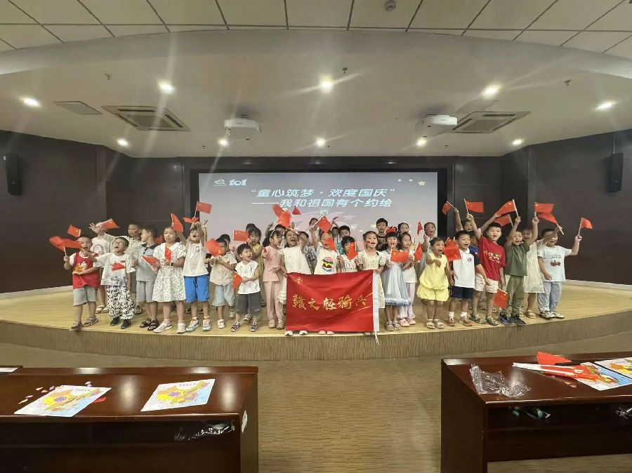 活动尾声,孩子们手持五星红旗,在"童心筑梦·欢度国庆"的屏幕前合影留念。一张张笑脸,一面面红旗,构成了这个国庆节最温暖的画面。