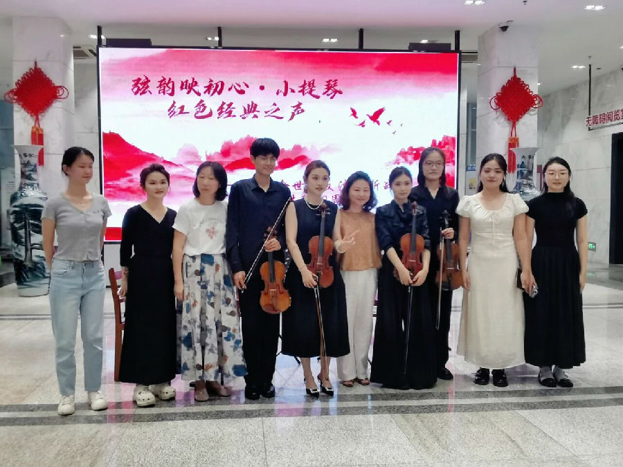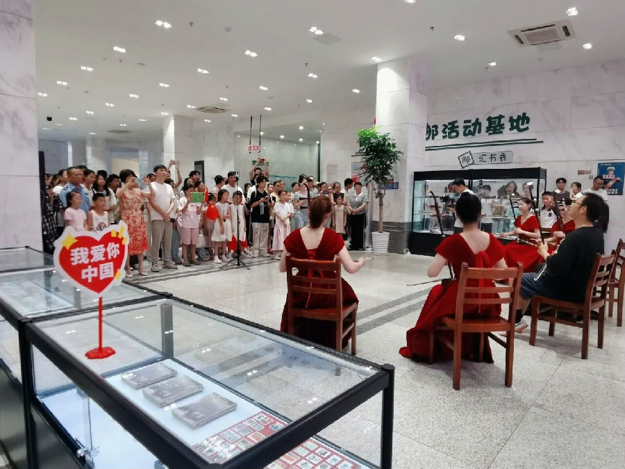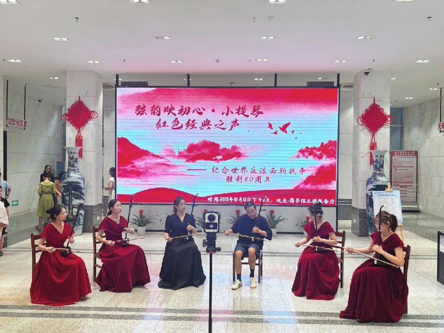 周日下午临近闭馆时间,越来越多读者聚集在一楼大厅,驻足张望。当悠扬的二胡声响起,由抚州市音协民族音乐委员会带来的二胡表演拉开活动序幕。接着,多位专业演奏者演绎的小提琴四重奏将活动推向高潮,演奏者之间配合默契,音色层次丰富。两种源于不同文化背景的乐器,为在场读者带来了一场音乐盛宴。