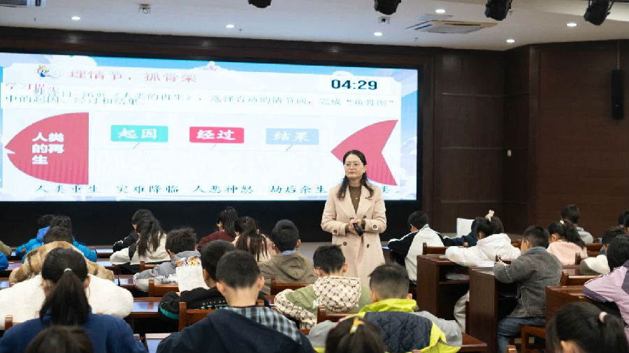 兴趣盎然的学生们首先化身“故事脉络梳理师”,在江老师巧设悬念的引导下,开启《人类的再生》初读之旅。他们借助学习提示与鱼骨图这一实用工具,默读故事时认真挑选合适的情节词完成填写。随后,学生汇报并依据完成的鱼骨图说故事主要内容,在实践操作中熟练掌握了“理情节,抓骨架”的阅读方法。